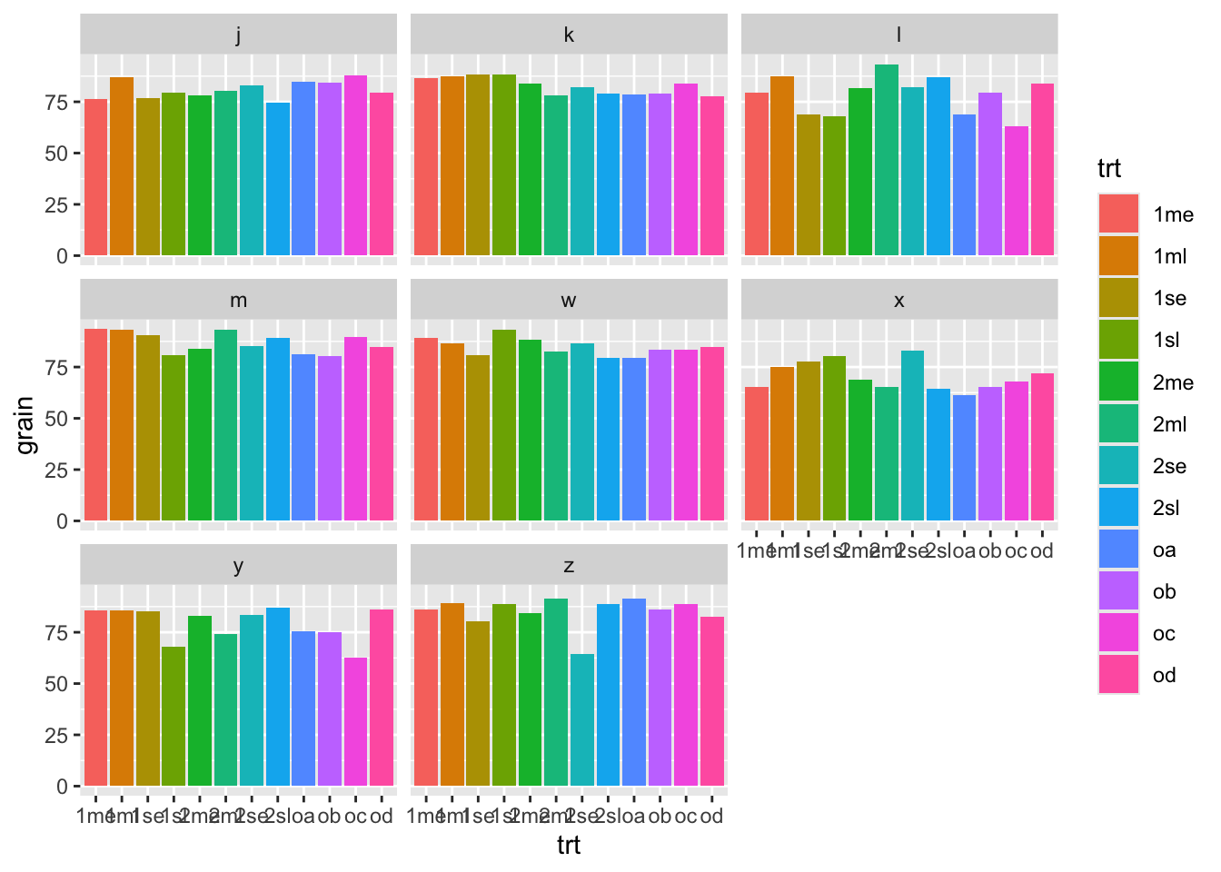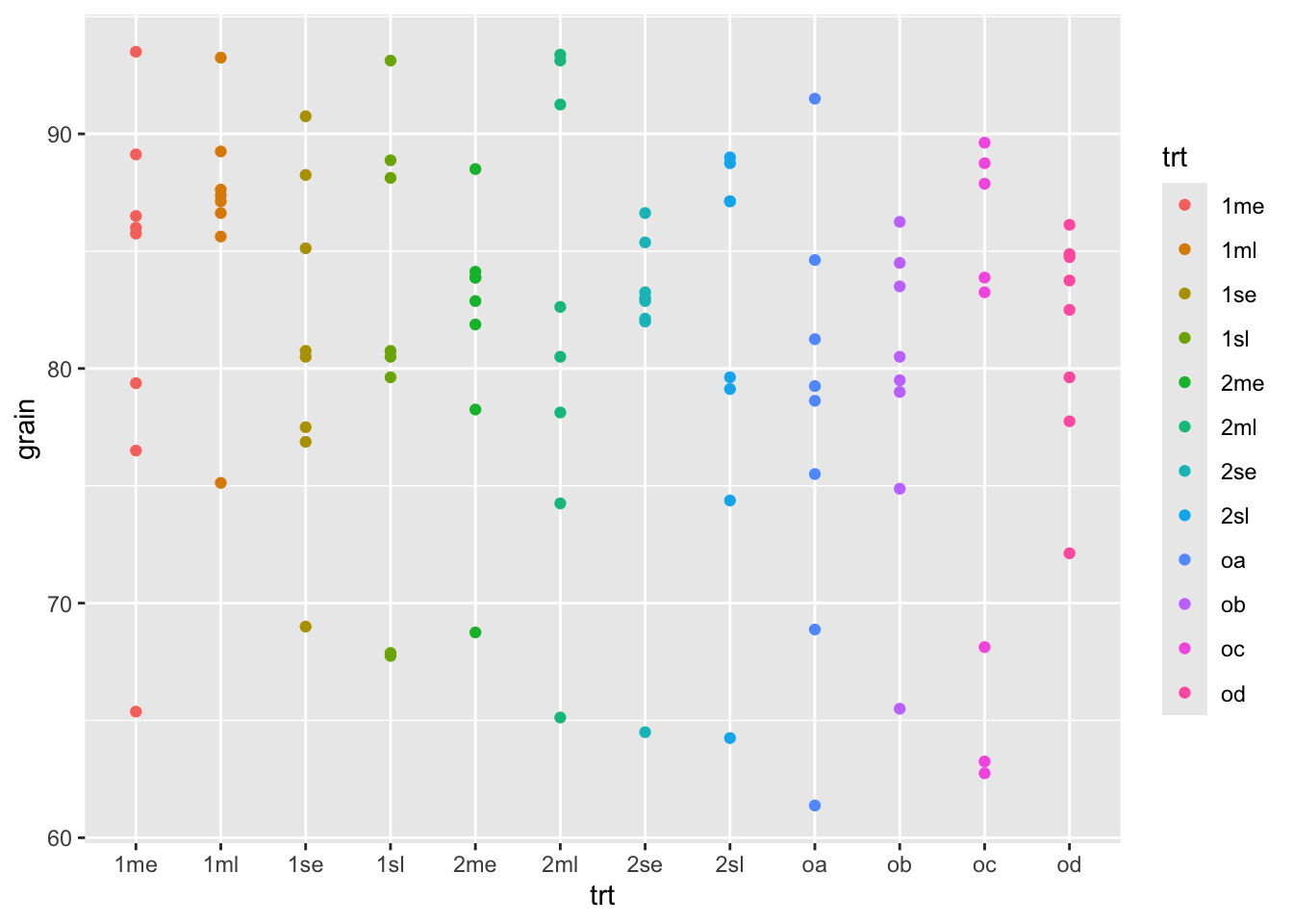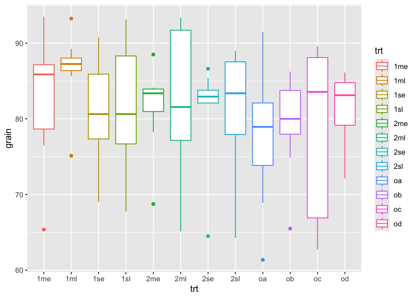 ggplot(rothamsted.oats, aes(x = trt, y = grain)) +