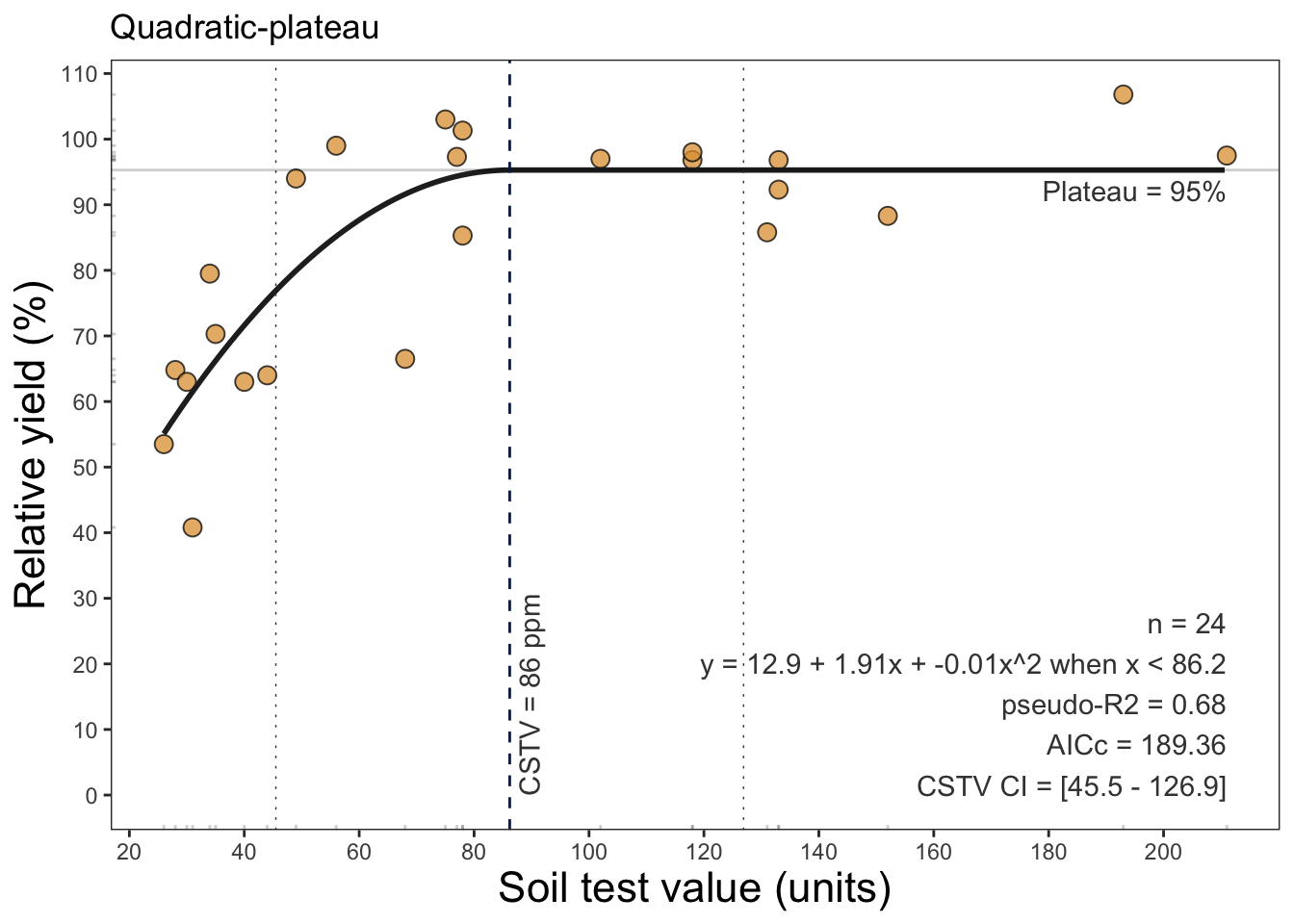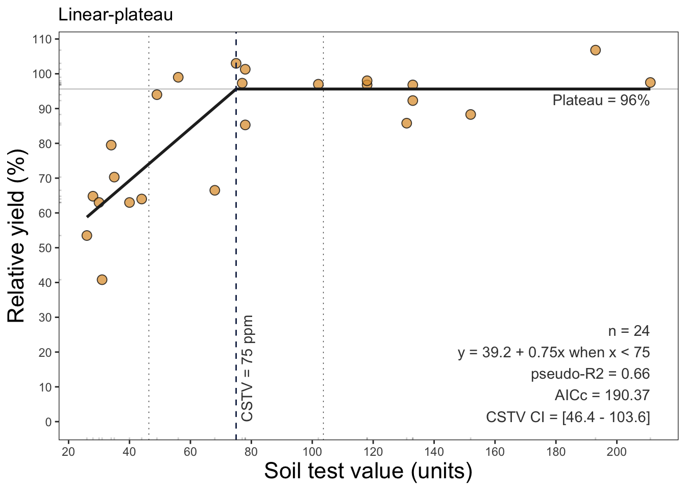 For example, we can fit a linear-plateu model the a dataset with: