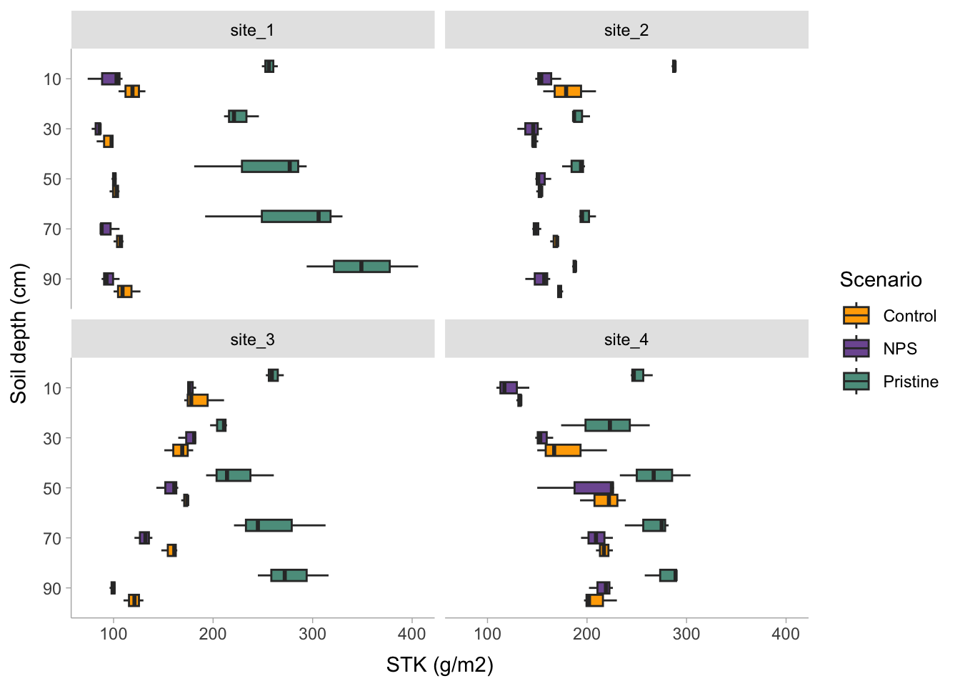 Figure 2. Soil profiles of STK (\(g~m^{-2}\)) under three different conditions: pristine soils (green circles), under grain cropping from 2000 to 2009 with no fertilizers added (Control, orange triangles), and under grain cropping from 2000 to 2009 with N, P, plus S fertilization (NPS, purple diamonds). Overlapping error bars indicate absence of significant differences between scenarios by soil depths combinations (0.05).