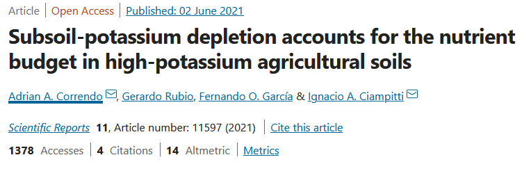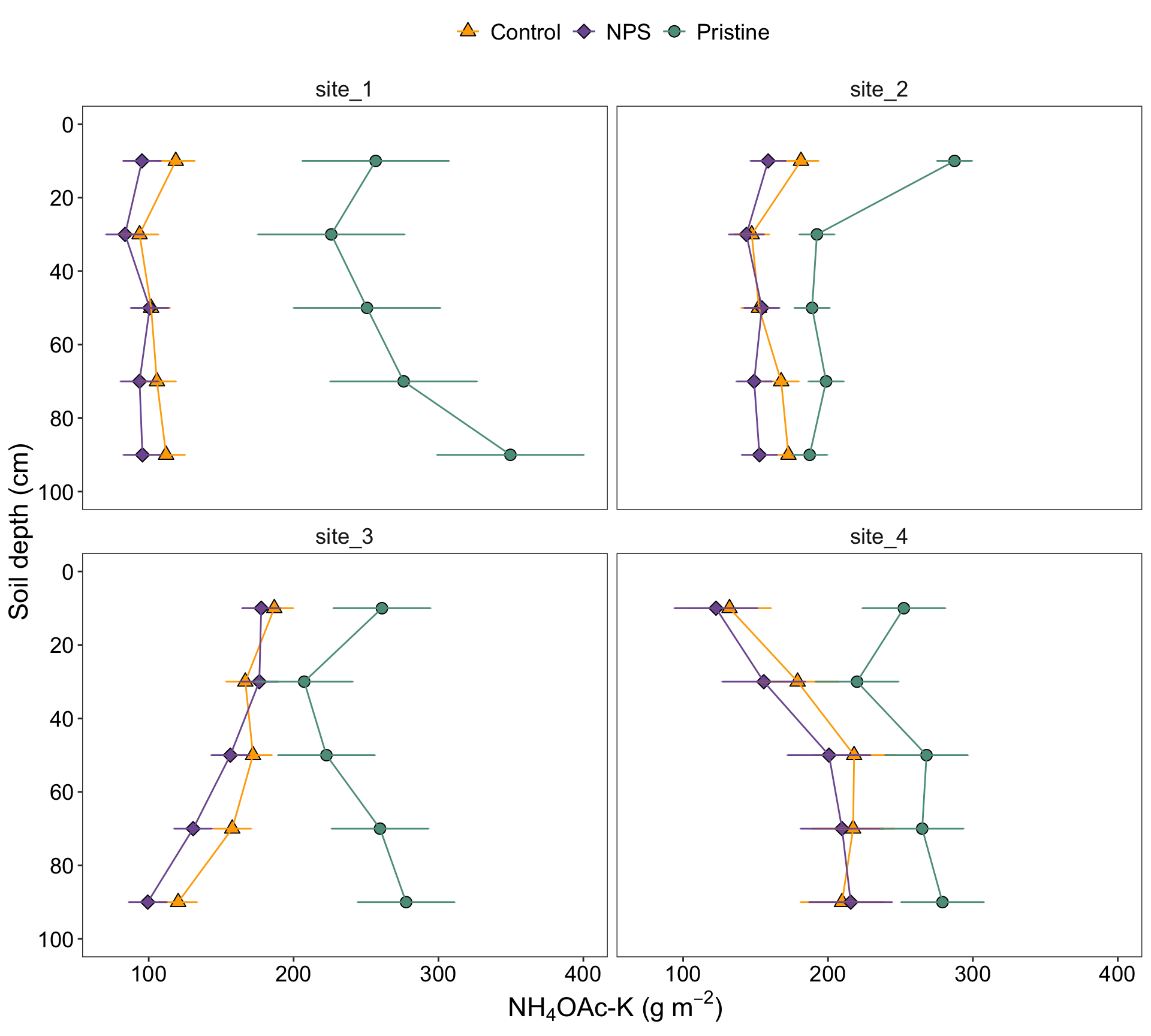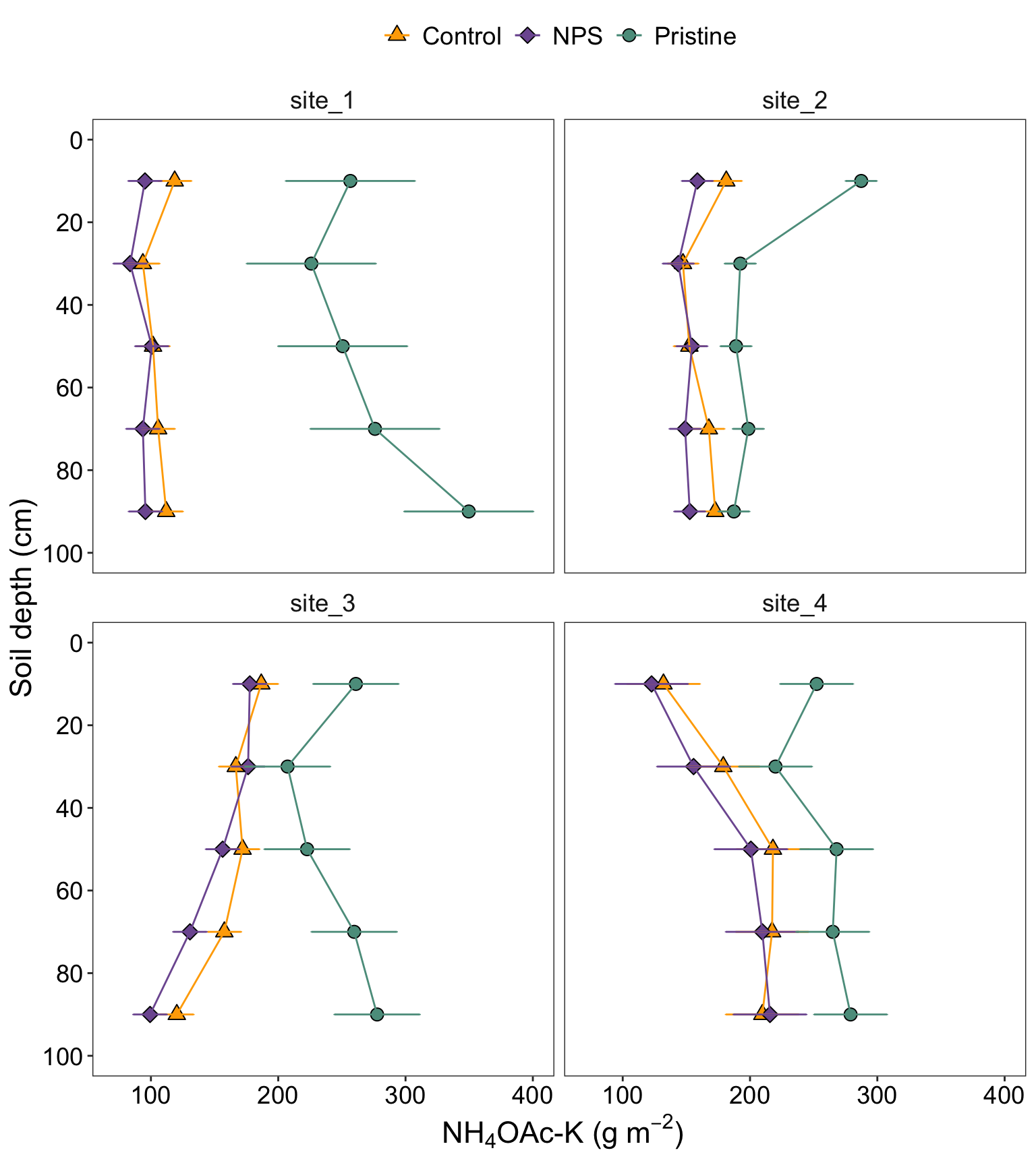 For this paper, we have data from 4 different locations. We tested the levels of soil potassium fertility, hereinafter as soil test K (STK), in long-term experiments (2000-2009) where the treatments of interest were: (i) Control (unfertilized), (ii) NPS (fertilized with NPS), and (iii) Pristine conditions (No Ag-history).
