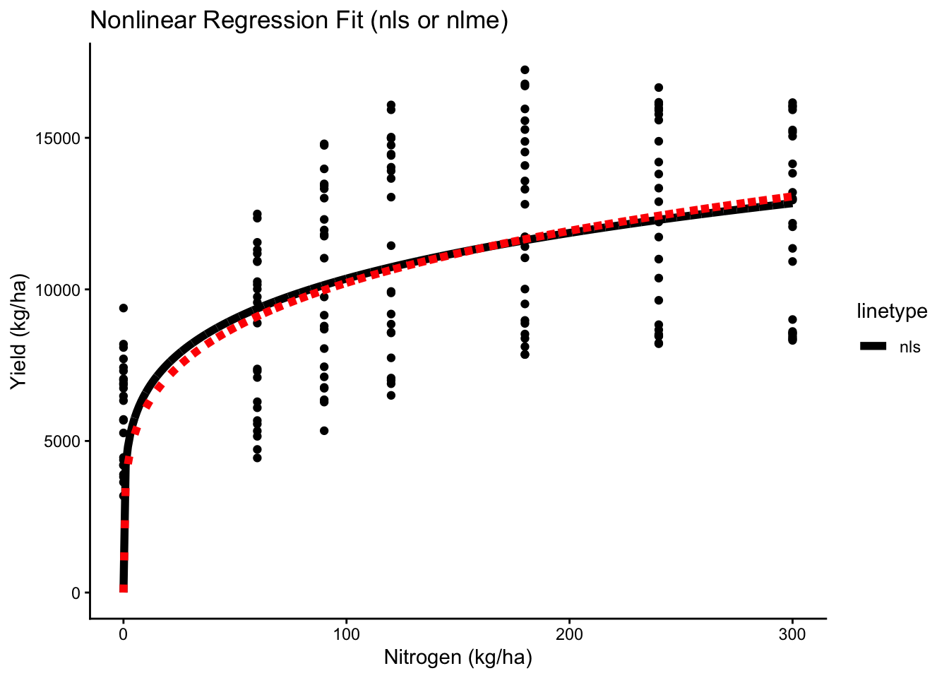 geom_line(data = new_preds, aes(x = nrate_kgha, y = yield_nls, linetype = "nls"),