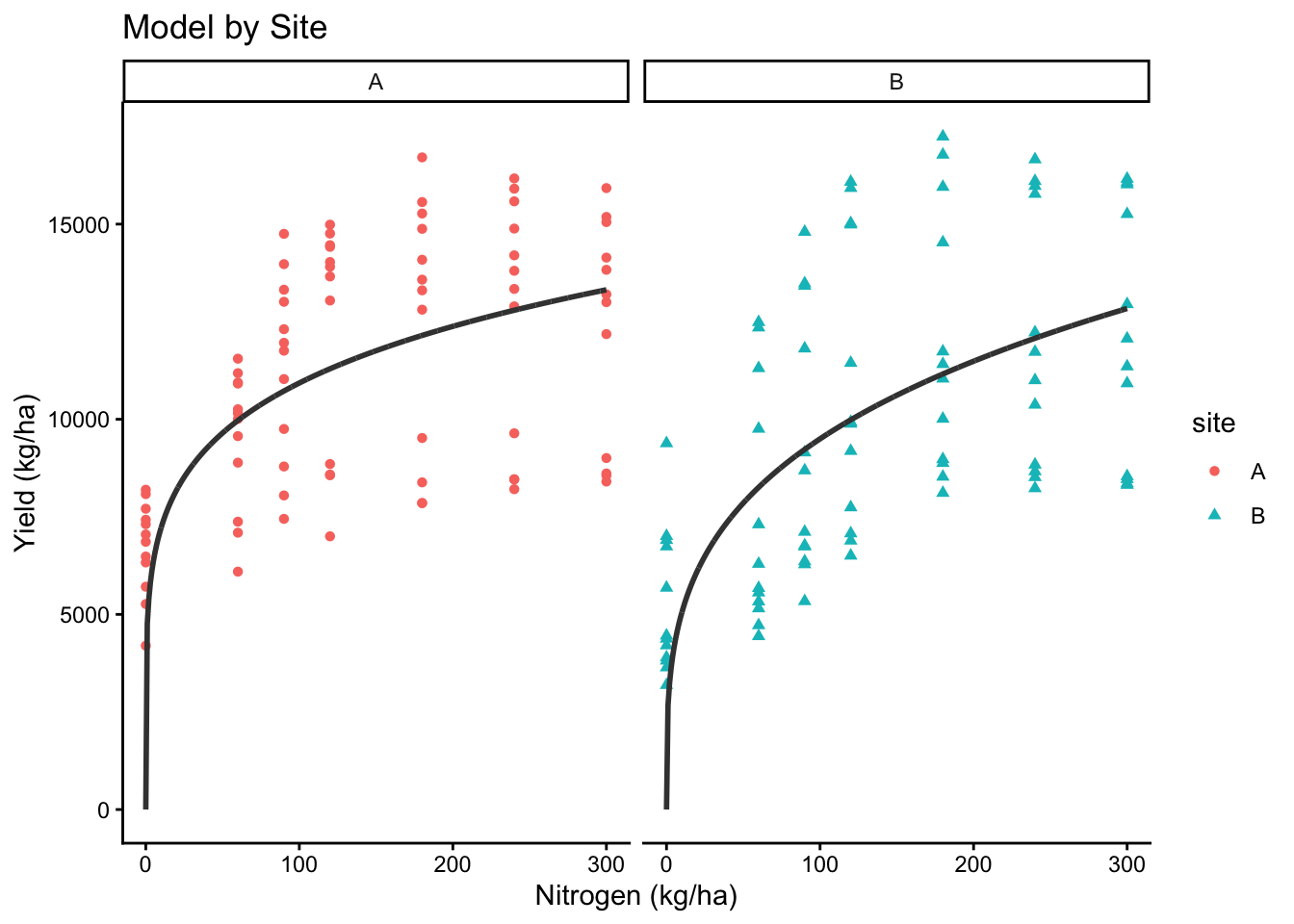 labs(title = "Model by Site", x = "Nitrogen (kg/ha)", y = "Yield (kg/ha)")+
