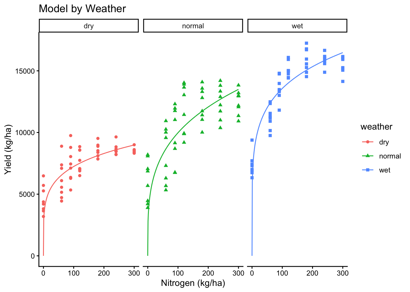 labs(title = "Model by Weather", x = "Nitrogen (kg/ha)", y = "Yield (kg/ha)")+