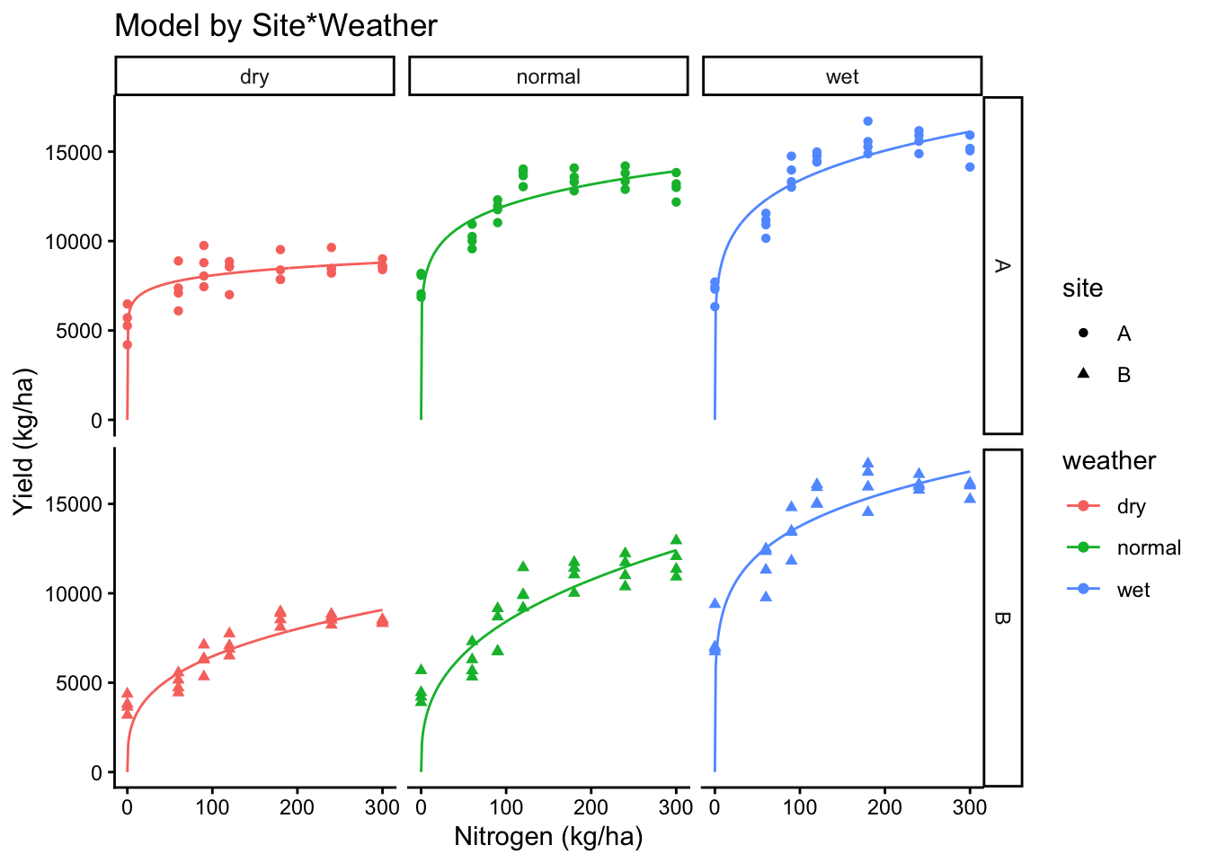 labs(title = "Model by Site*Weather", x = "Nitrogen (kg/ha)", y = "Yield (kg/ha)")+