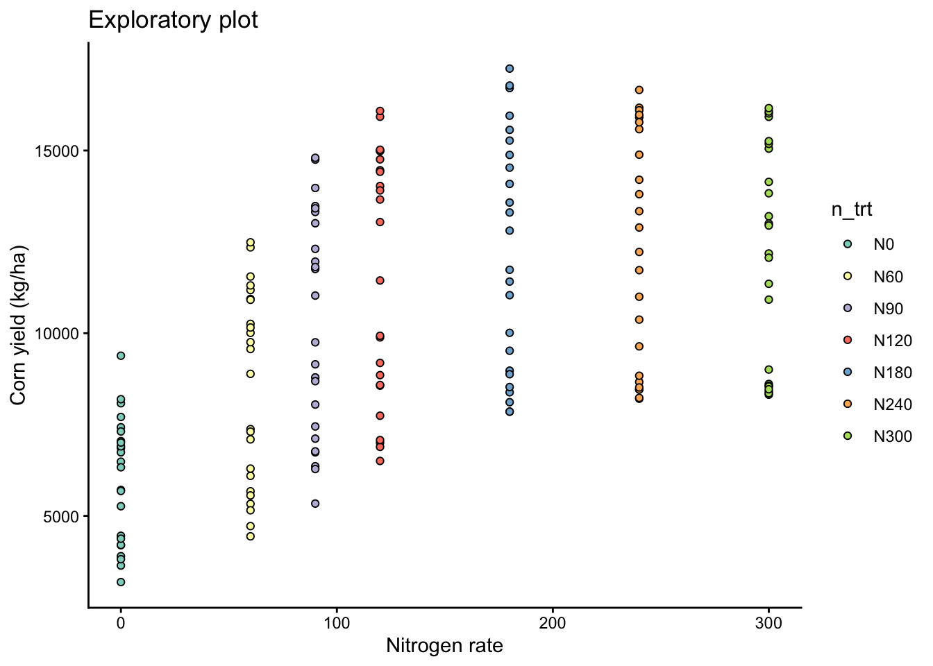 x = "Nitrogen (kg/ha)", y = "Yield (kg/ha)")