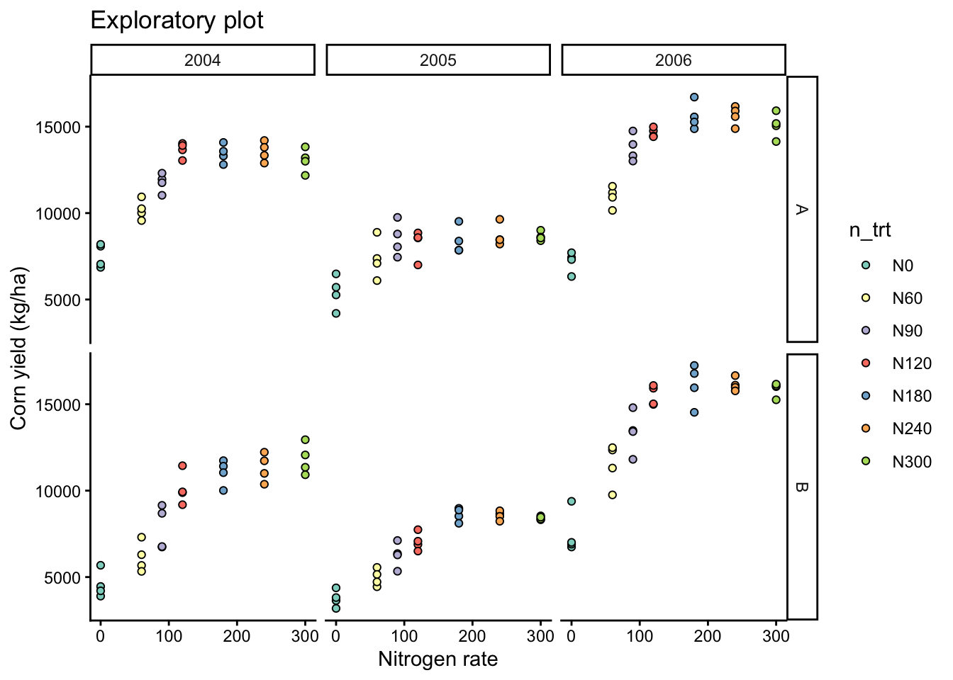 We will again use our synthetic dataset of corn yield response to nitrogen fertilizer across two sites and three years with contrasting weather.