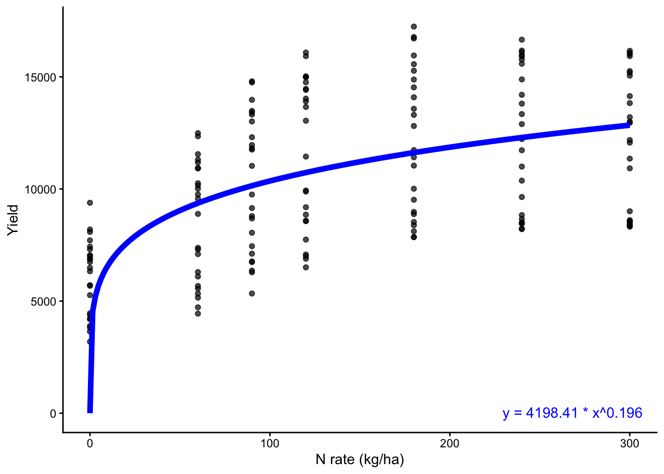 nls_model <- nls(yield ~ a * nrate_kgha^b, data = cornn_data,
