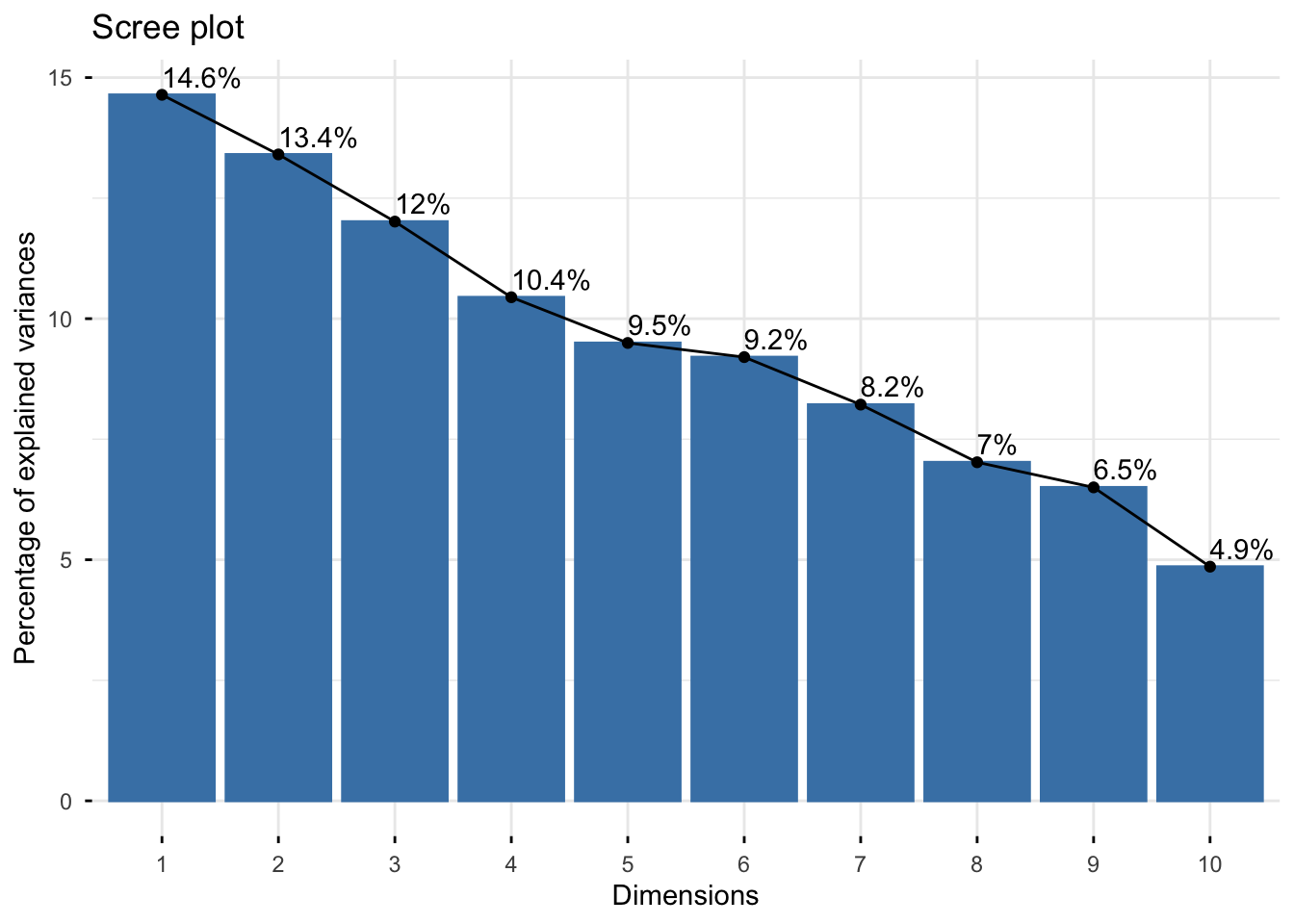 fviz_eig(pca_fm, addlabels = TRUE)