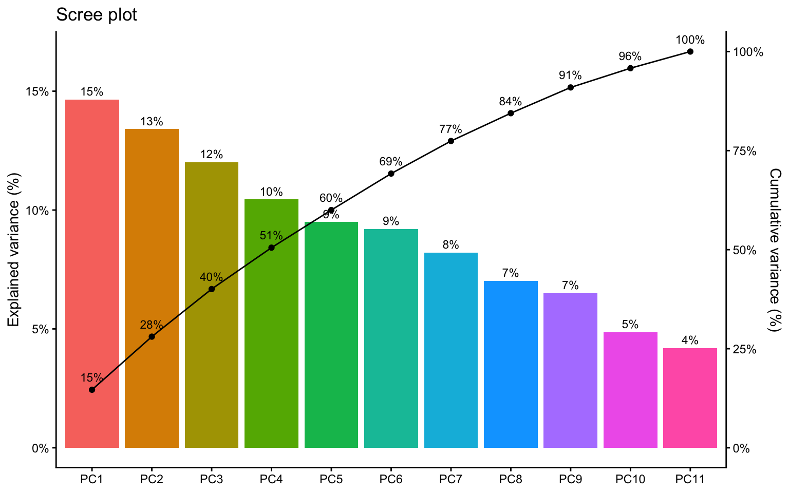 A common misunderstanding appears when PCA is run on only two variables. In that case, the two principal components necessarily span the full two-dimensional space, so the total variance explained by PC1 and PC2 is always 100%.