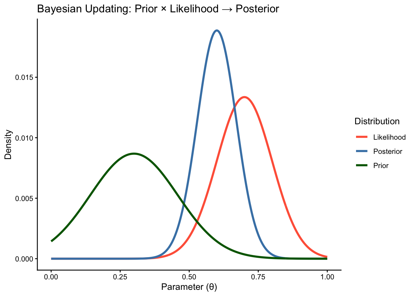 The following figure is a conceptual sketch of Bayesian updating. It is meant to illustrate the idea of combining prior information with observed data through the likelihood to obtain a posterior distribution.