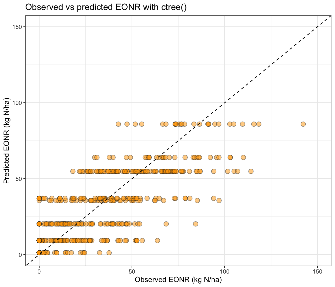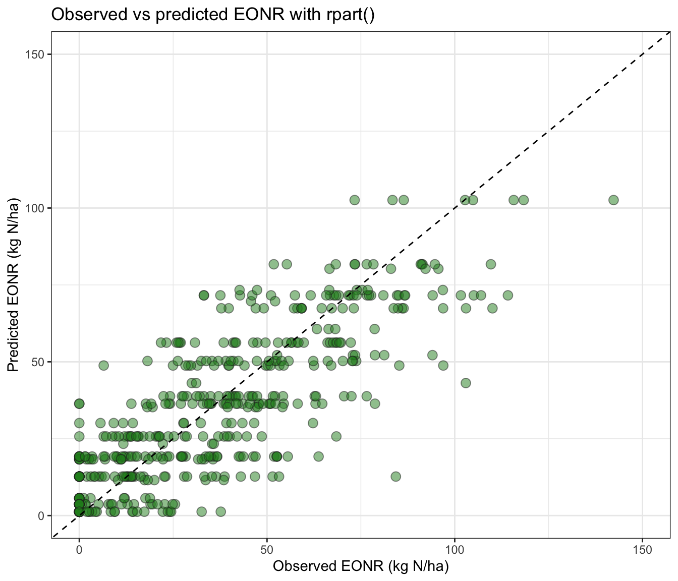 # Basic ggplot for observed vs predictedtest_df %>%ggplot(aes(x = eonr_kgha, y = pred_rpart_eonr)) +geom_point(alpha =0.5, shape =21, size =3,fill ="forestgreen", color ="grey15") +geom_abline(intercept =0, slope =1, linetype =2) +scale_x_continuous(limits =c(0, 150), breaks =seq(0,200, by=50)) +scale_y_continuous(limits =c(0, 150), breaks =seq(0,200, by=50)) +labs(title ="Observed vs predicted EONR with rpart()",x ="Observed EONR (kg N/ha)",y ="Predicted EONR (kg N/ha)" )+theme_bw()