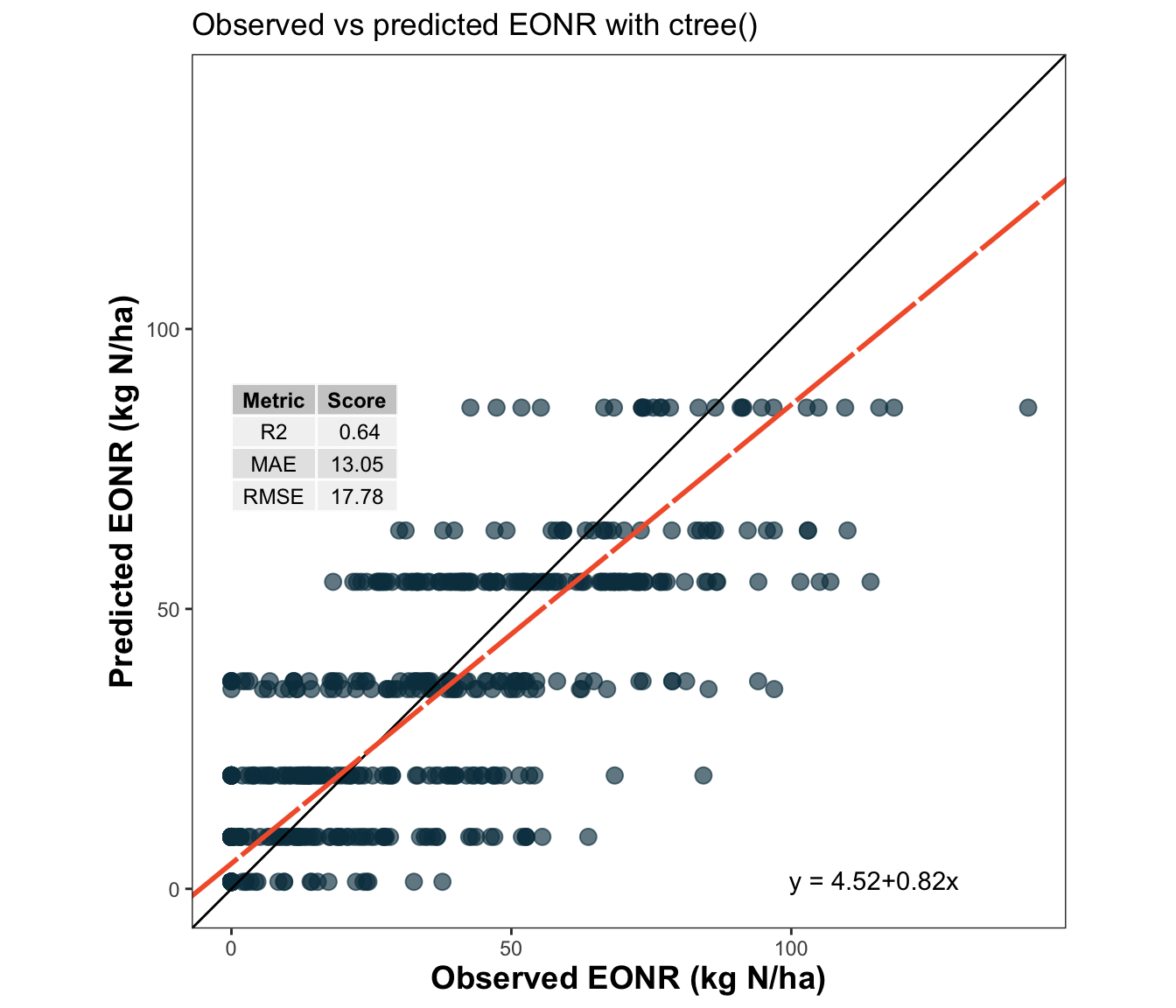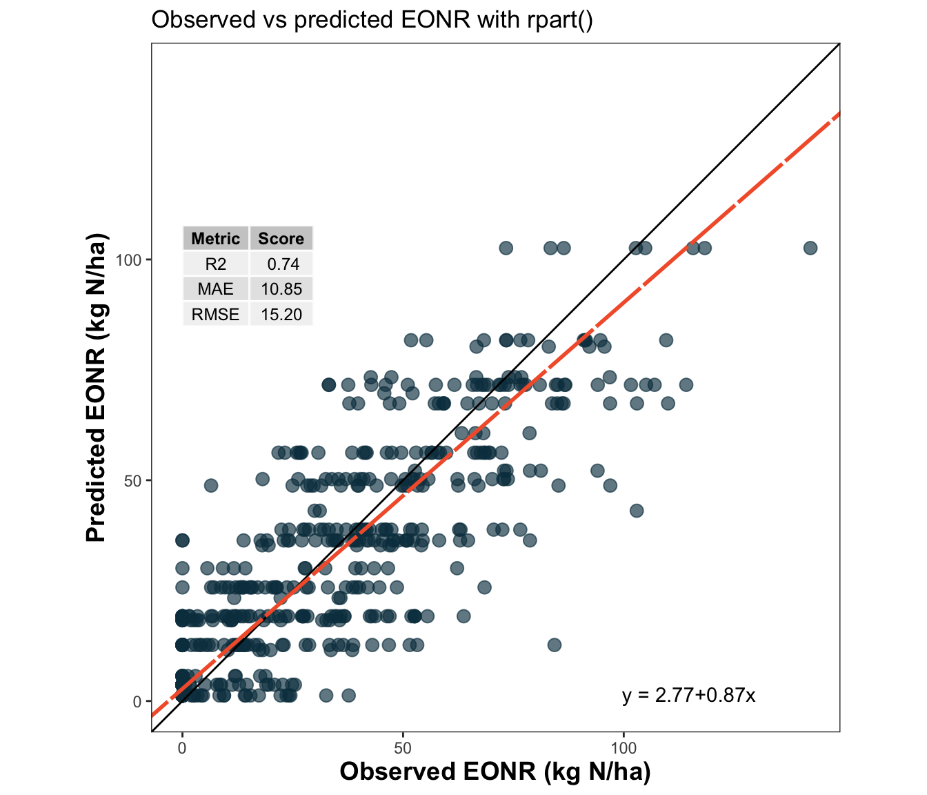 # Use metrica's scatter_plot for a more standardized visualization# You can print metrics on the plot and draw a regression trendlinemetrica::scatter_plot(data = test_df,obs = eonr_kgha,pred = pred_rpart_eonr,print_metrics =TRUE,metrics_list =c("RMSE", "MAE", "R2") )+scale_x_continuous(limits =c(0, 200), breaks =seq(0,200, by=50)) +scale_y_continuous(limits =c(0, 200), breaks =seq(0,200, by=50)) +labs(title ="Observed vs predicted EONR with rpart()",x ="Observed EONR (kg N/ha)",y ="Predicted EONR (kg N/ha)" )