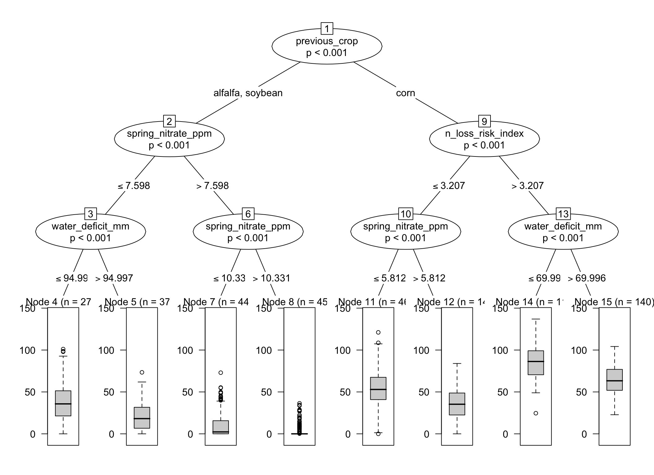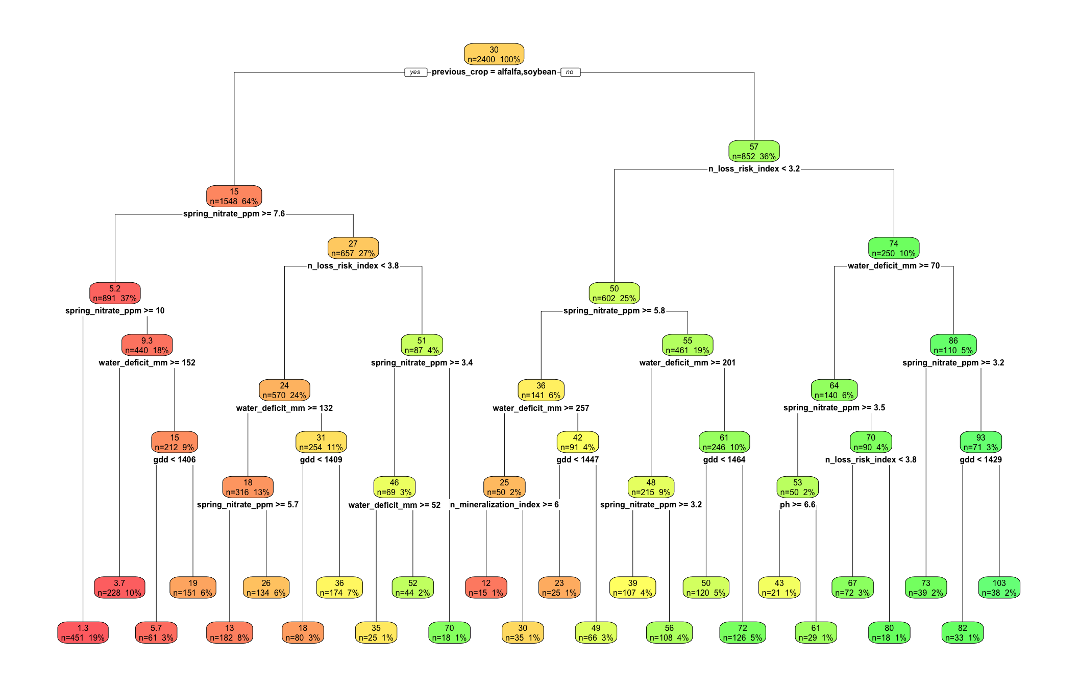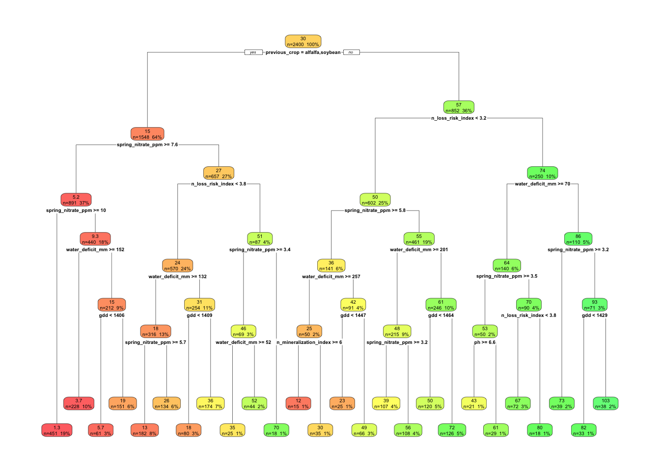 For example, a split on previous_crop followed by spring_nitrate_ppm would make agronomic sense for EONR because those variables are directly related to N supply.