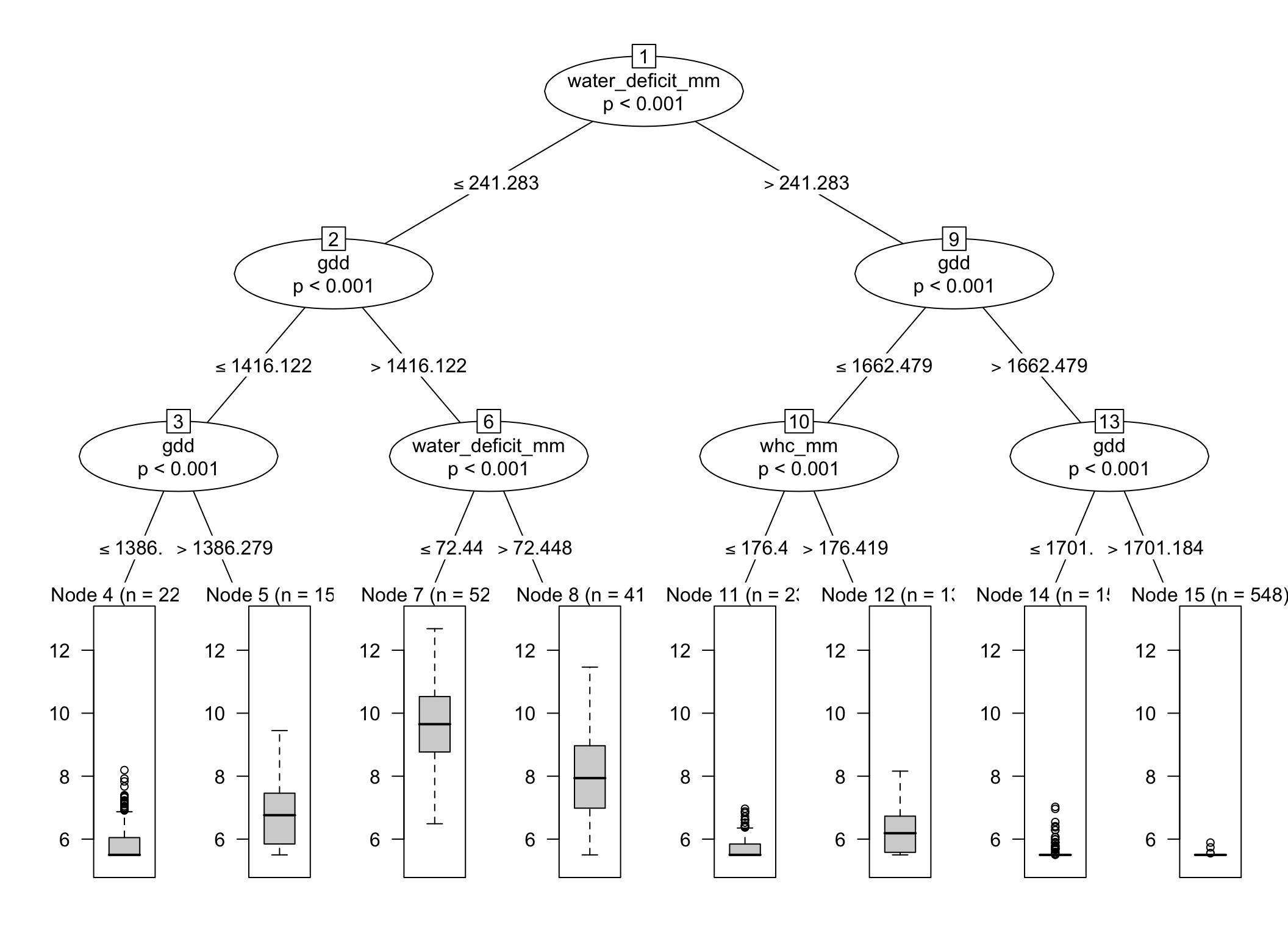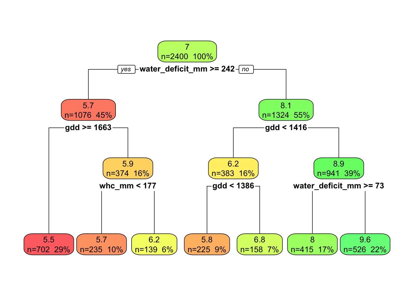Likewise, a split on water_deficit_mm or whc_mm would make sense for yield because those variables affect crop water availability.