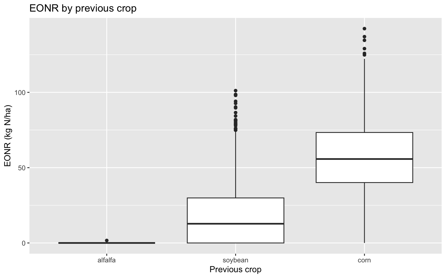 corn_eonr %>%ggplot(aes(x = previous_crop, y = eonr_kgha)) +geom_boxplot() +labs(title ="EONR by previous crop",x ="Previous crop",y ="EONR (kg N/ha)" )