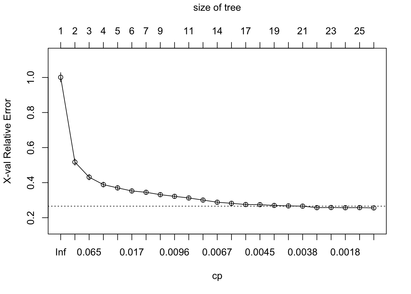 A fully grown tree often overfits the training data. One strength of rpart() is that it provides a complexity parameter table that helps us inspect pruning candidates.