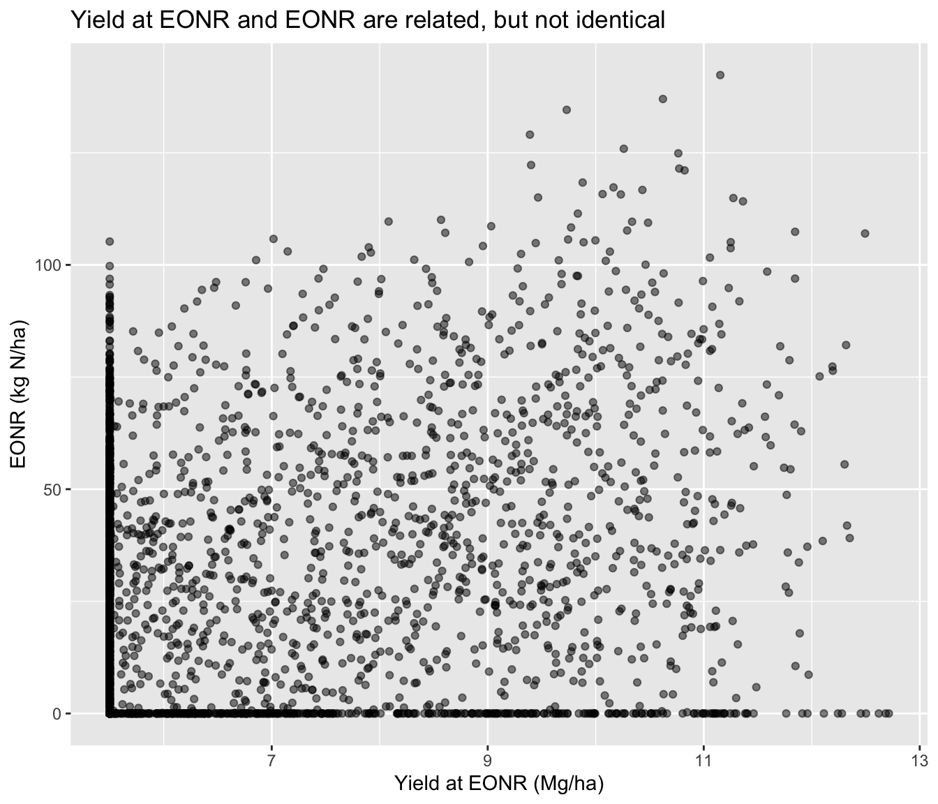 corn_eonr %>%ggplot(aes(x = yield_eonr_Mg_ha, y = eonr_kgha)) +geom_point(alpha =0.5, #aes(color = site) ) +labs(title ="Yield at EONR and EONR are related, but not identical",x ="Yield at EONR (Mg/ha)",y ="EONR (kg N/ha)" )
