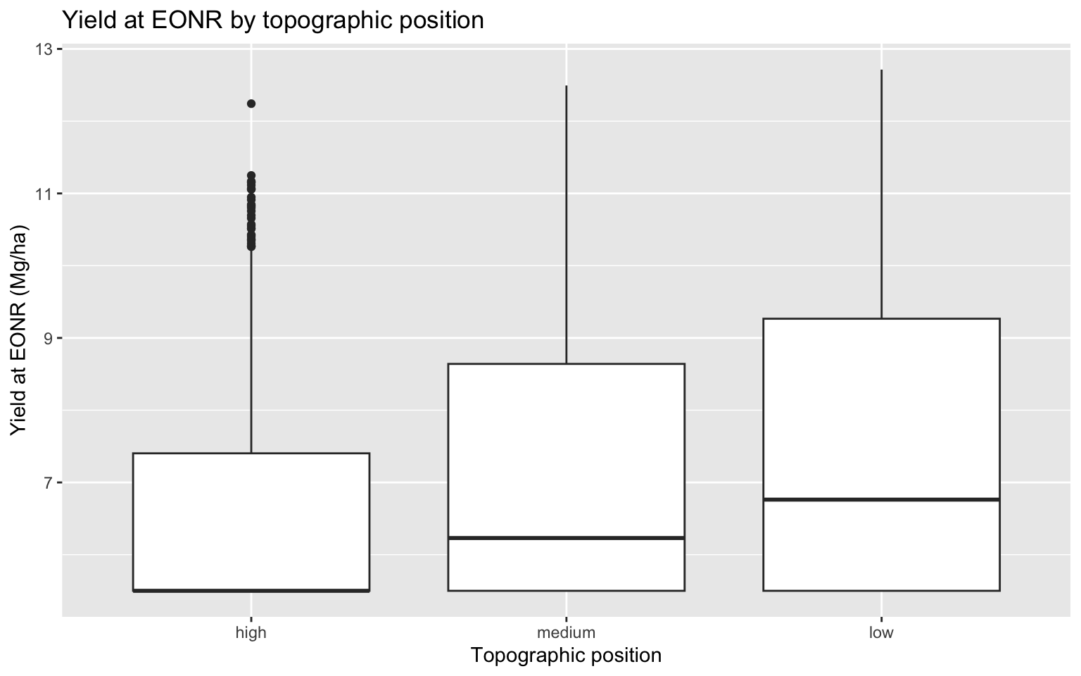 corn_eonr %>%ggplot(aes(x = topo_pos, y = yield_eonr_Mg_ha)) +geom_boxplot() +labs(title ="Yield at EONR by topographic position",x ="Topographic position",y ="Yield at EONR (Mg/ha)" )
